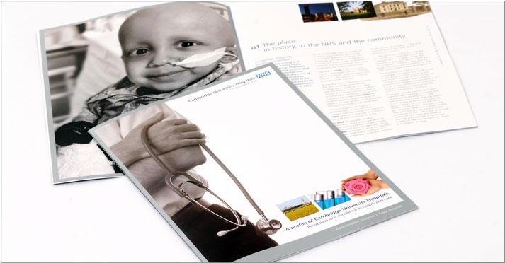 Project: Profile brochure 2008 | Client: Addenbrooke's Hospital The brief was given by the Communications team at Addenbrooke’s to design a new corporate brochure to promote the hospital. The intended target audience included patients, researchers and visitors, and so the brochure was to act as a flag ship for the hospital. The final brochure combined the use of impactful black and white photography with a printed metallic silver and clean modern typography. |