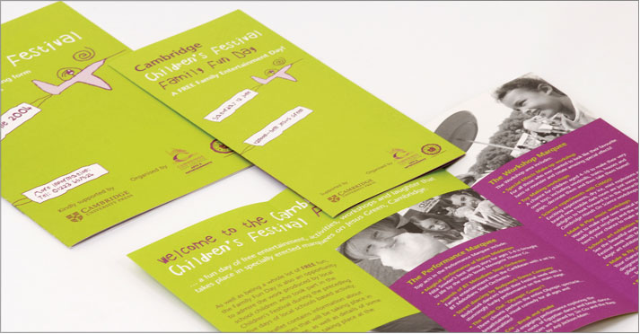 Project: Children’s Festival publicity | Client: Cambridge City Council The brief was to create a look and feel for the Cambridge Children’s Festival. The festival takes place in Cambridge every year and is open to families. The design had to be eye catching and fun, so to encourage children and their families to attend. The final design combined a simple illustration style with bright colours to achieve a fun look for the publicity, which included leaflets and posters. |